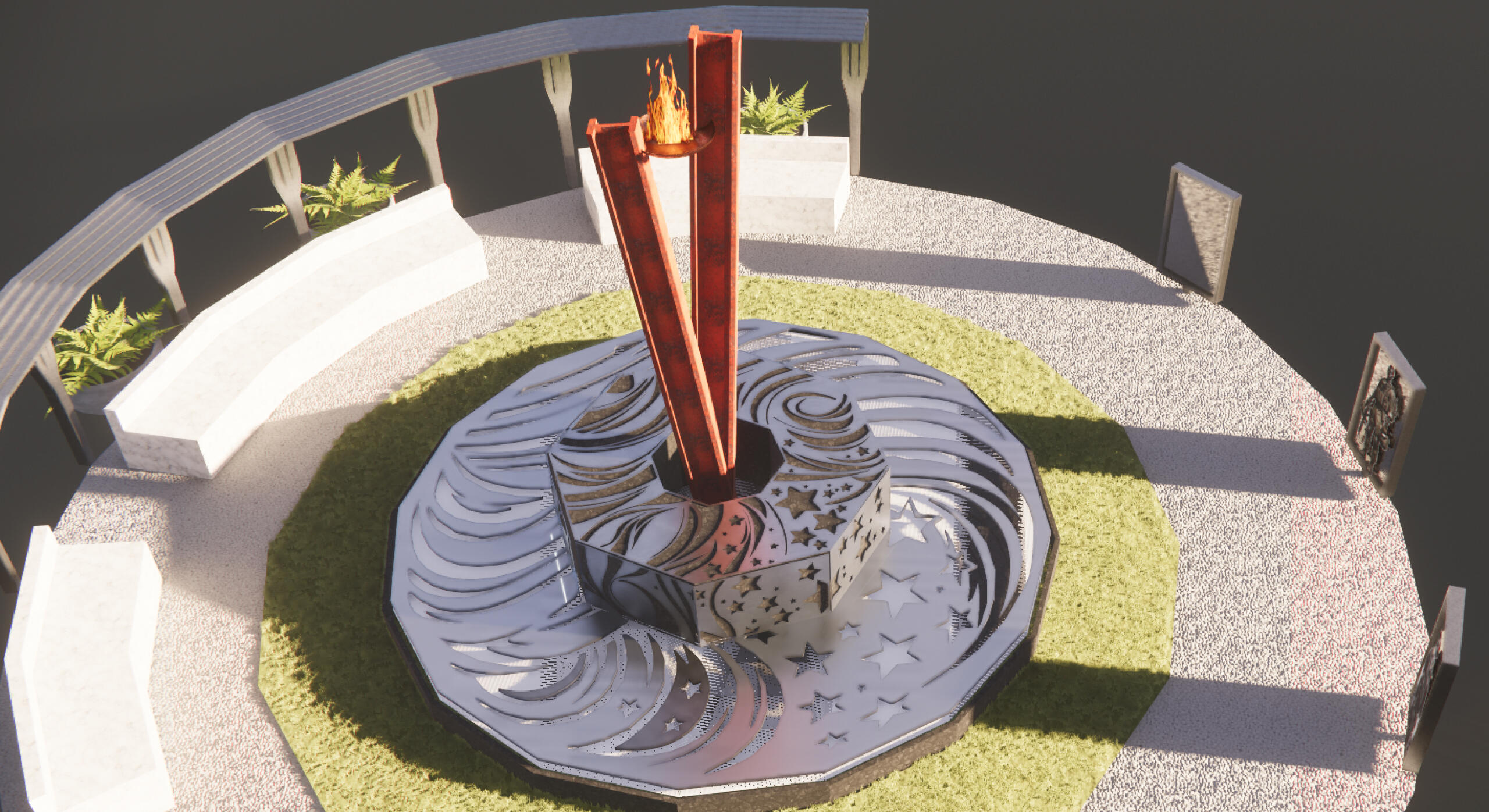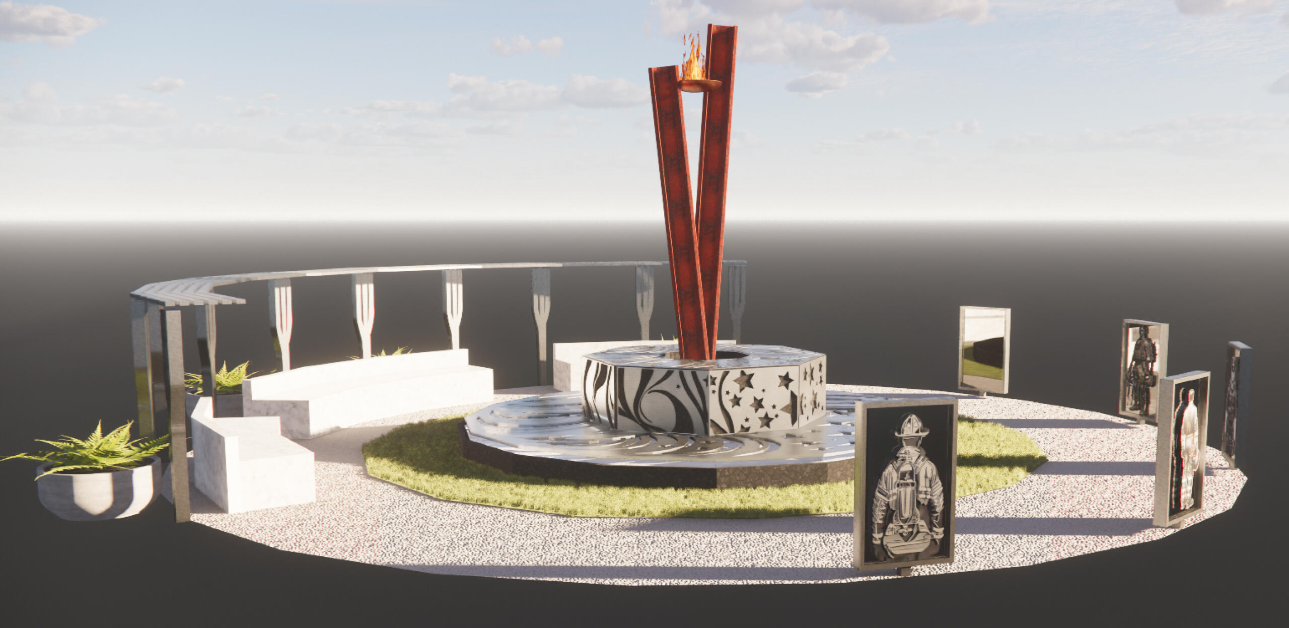 The centerpiece of the memorial is a powerful sculpture made from steel beams recovered from the World Trade Center. This sculpture is complemented by a serene fountain and waterfall, symbolizing the flow of time and the cleansing of sorrow, and an eternal flame representing eternal remembrance. Surrounding the memorial are images of different people affected by 9/11, created by talented local artists from Richmond, CA, and brought to life through stacked metal layers. Together, these elements symbolize the profound change that the events of 9/11 brought to the world, our collective failure, and our enduring hope for the future. Visitors are invited to reflect on the impact of 9/11 and to be inspired by the resilience and unity that arose from the tragedy.