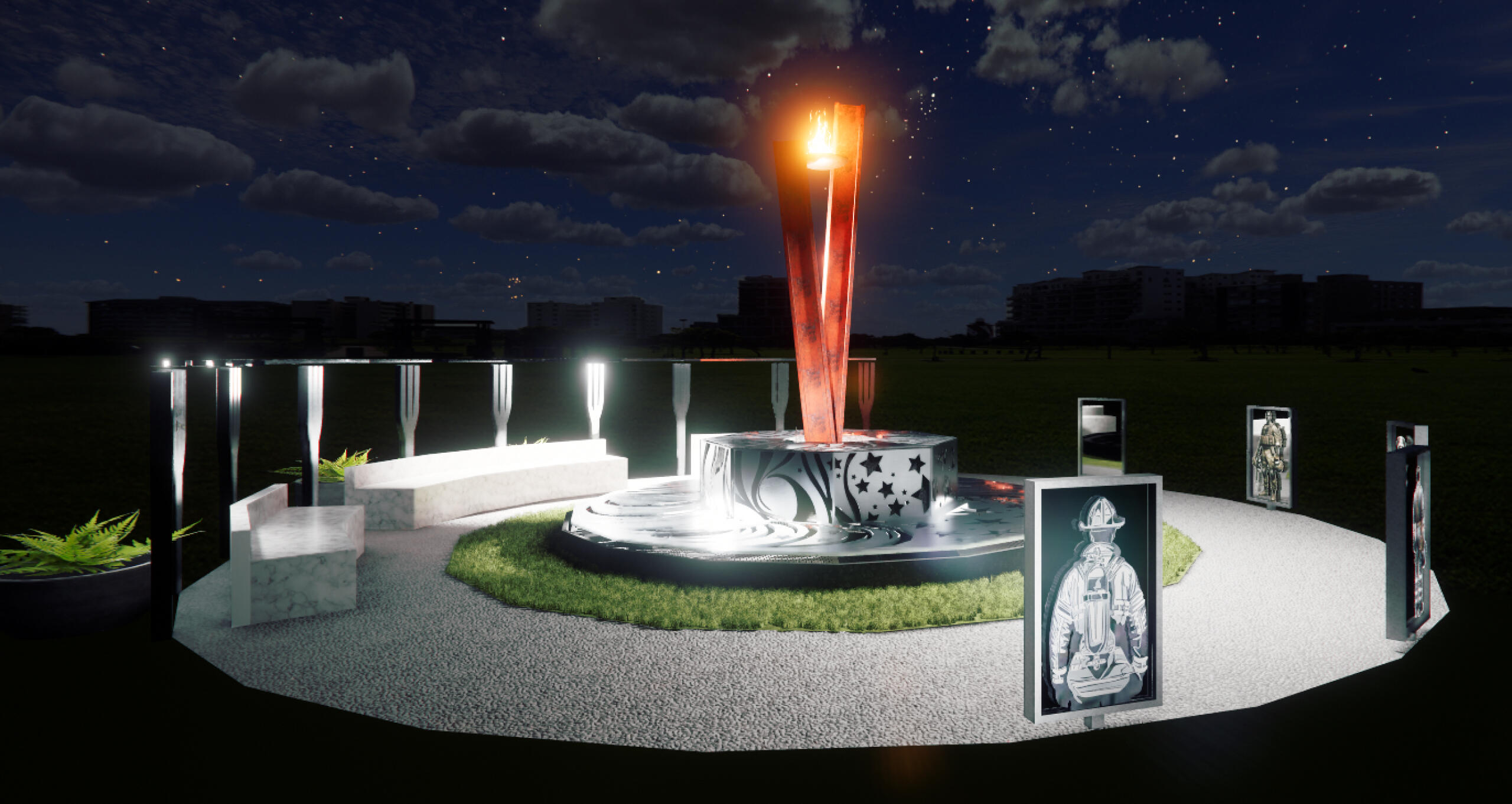 The 9/11 Memorial Project is a tribute not only to those who lost their lives but also to the lasting global impact of the September 11 attacks. Located on our fire department training grounds, this memorial is constructed from authentic World Trade Center steel beams. The design includes a fountain, waterfall, and an eternal flame, symbolizing the flow of time, the cleansing of sorrow, and eternal remembrance. This project aims to create a space that acknowledges the ways in which humanity failed on that day and encourages us to aspire toward a more hopeful and united future.